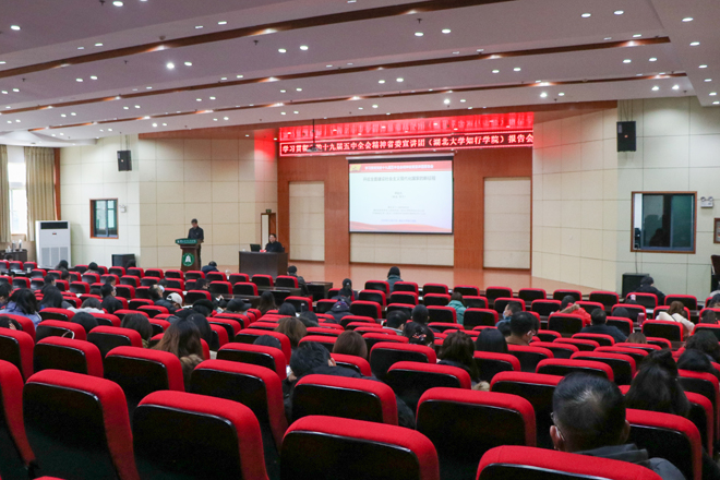 根据湖北省委统一安排,11月27日下午,湖北省委讲师团专家、中国地质大学教授邓宏兵莅临学校宣讲党的十九届五中全会精神。校党委书记彭德忠主持报告会。师生党员200多人现场聆听报告会。