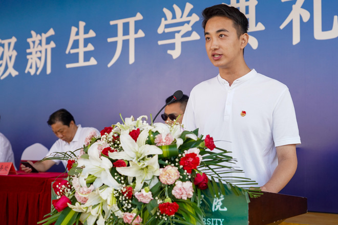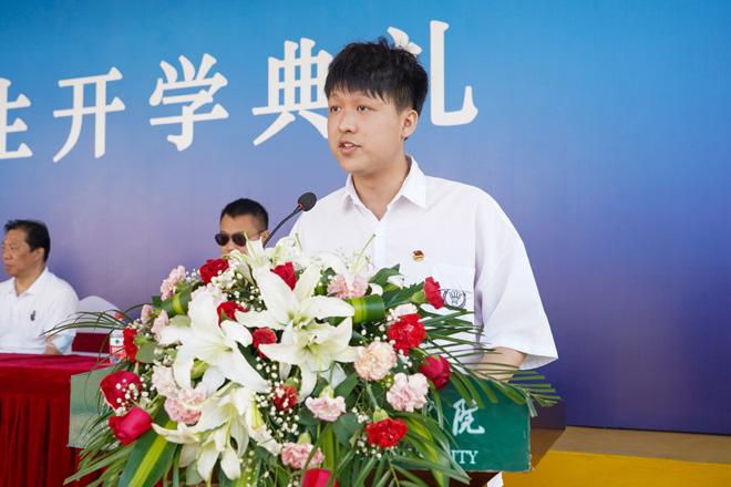 在校生代表、人文学院肖俊飞同学在发言中结合自身成长成才经历鼓励2021级新同学秉承“厚德载物 认知践行”的校训精神,做到爱国爱校、求真探索、躬耕实践,以青春之我、奋斗之我迎来属于自己的高光时刻。新生代表、艺术与设计学院李文智同学在发言中表示将立足新起点,以实际行动践行“强国有我,请党放心”的誓言和担当。经济与管理学院辅导员甘露作为教师代表在发言中勉励2021级新同学做到心中有梦想、肩上有责任、脚下有力量,以奋斗之青春书写崭新的人生华章。