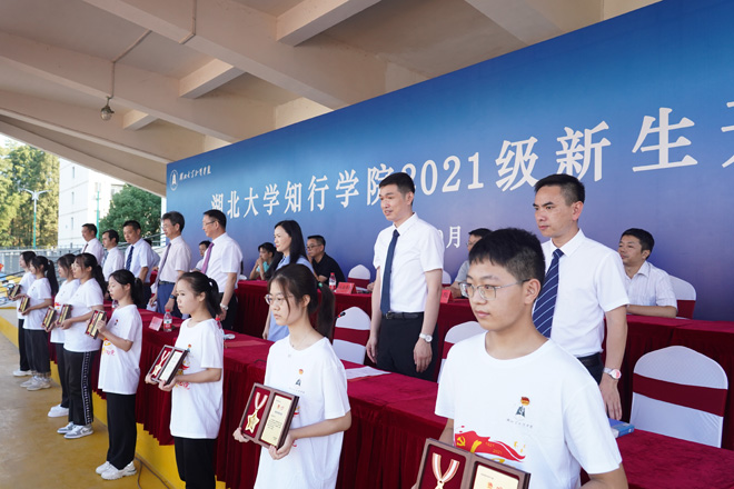 典礼开始前,校艺术团的同学以动感十足的舞蹈表演表达着对新生的欢迎,红杉林合唱团的同学带领全体新生挥舞手中的党旗,齐声合唱《青春赞歌》《灯火里的中国》《我和我的祖国》等歌曲,歌颂着对党和祖国的热爱,现场气氛热烈。典礼在雄壮的国歌声中拉开帷幕。学校党委委员、疫情防控和防汛工作办公室主任刘张虎宣读《关于表彰2021级新生“青年抗疫先锋”“青年防汛救灾先锋”的决定》。校党委书记彭德忠、校长卜诗桢等在主席台就座的校领导为受表彰的同学颁奖。