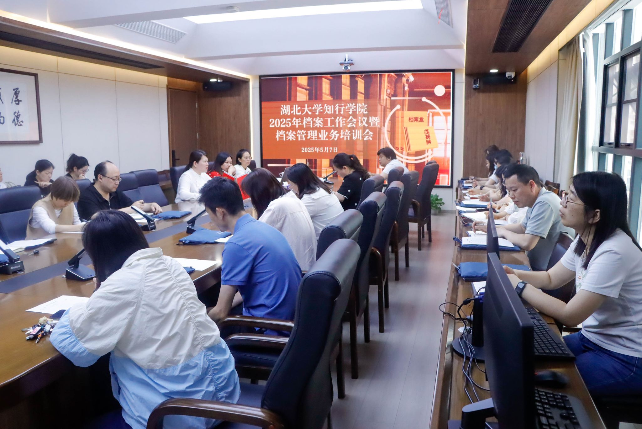 为进一步推进档案工作的规范化、制度化管理,5月7日上午,学校在知言楼三楼会议室召开2025年度档案工作会议暨档案管理业务培训会。学校党委委员、党委与行政办公室主任任秀霞主持会议。综合档案室工作人员及各单位兼职档案员参加会议。