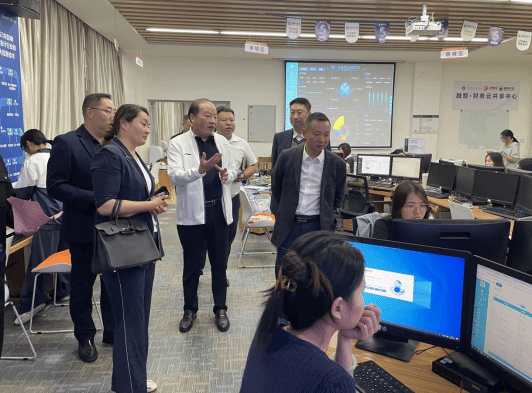 交流中,双方围绕产教深度融合展开多维探讨,剖析专业融合模式,探索协同育人机制,推动人才培养与产业需求精准匹配,并交流了实践教学策略及实训基地运营经验,强化学生实践能力培育。研讨结束后,何顺进一行深入到正誉智能财务产业学院开展实地调研,现场体验智能化平台运作全貌,解析动态可视化监控体系的风险预警与决策支持功能。产业学院将动态真实的企业数据引入学校教学,让同学们在课堂上就能接触到真实的财务数据以及规范的账税处理流程,有效提升了他们的实操能力。通过沉浸式调研,调研组直观感知了数字化财务共享模式的技术优势与运营价值,深化了对智能财税实践的认知理解。